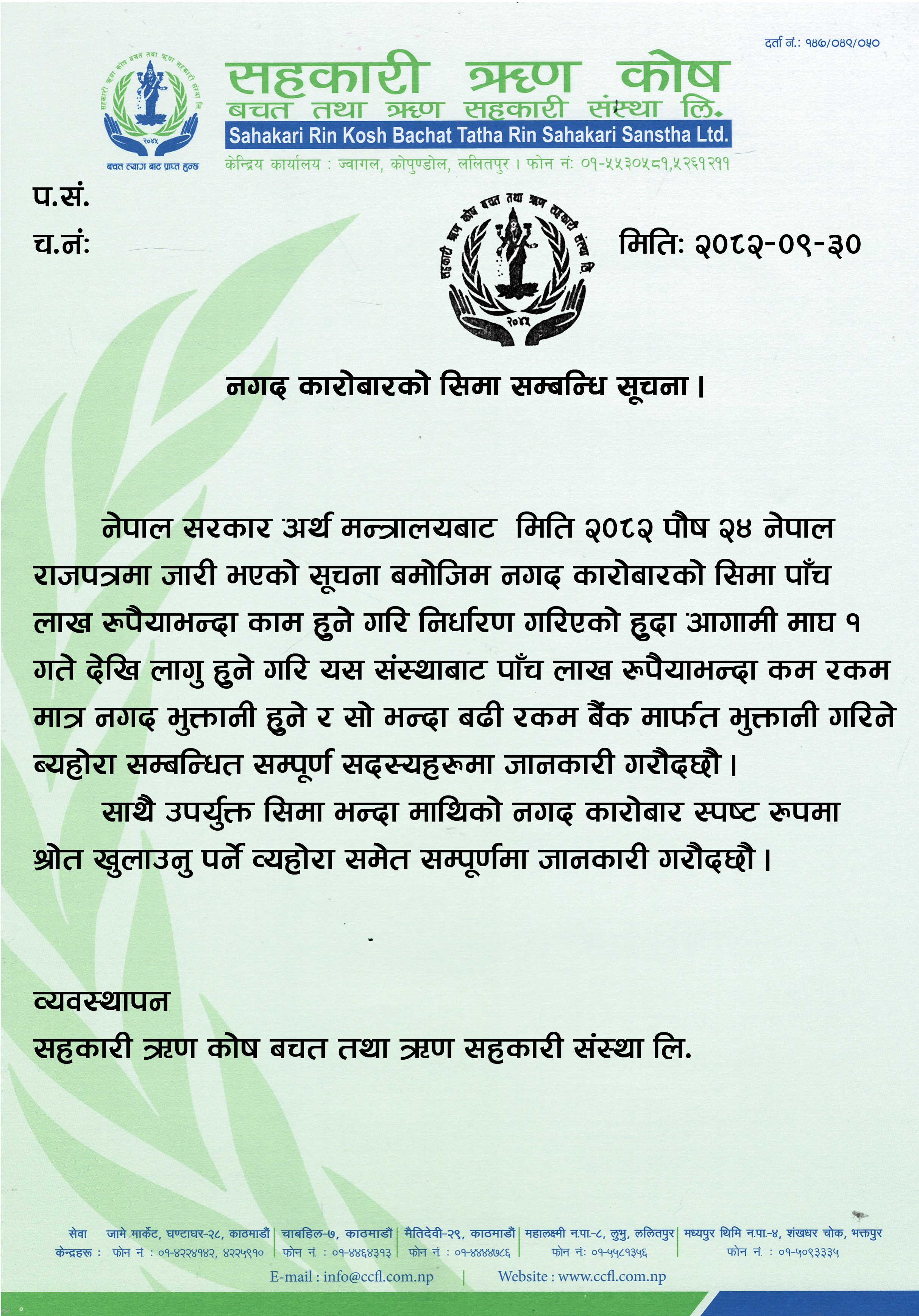 नेपाल सरकार सहकारी बिभागमा दर्ता भएको “सहकारी ऋण कोष बचत तथा ऋण सहकारी संस्था लि.” सहकारी ऐन २०४८ बमोजिम मिति २०४९ साल भाद्र ७ आइतबार (1992 Aug 23 Sunday) गते विधिवत रुपमा सहकारी बिभागमा (दर्ता नं: १४७/०४९/०५०) दर्ता भएर हाल सहकरी ऐन २०७४ बमोजिम कारोबार भएको संस्था हो। संस्थाको स्थापनाको दुई दशक माझ हामीलाई दिनु भएको निरन्तर सहयोग र सदभावको परिणाम स्वरूप २०७१ साल मंसिर देखि संस्थाकै सुबिधा सम्पन्न भवन कोपुण्डोल (ज्वागल) ललितपुरबाट सेवा प्रदान गर्न सफल भएका छौ भने सदस्यहरुलाई सर्वसुलभ रुपमा सेवा प्रदान गर्न (ABBS) तथा सहकारी मोबाइल बैंकिंग सेवा (ccfl ismart mobile Bainking), रेमिट सेवा, आन्तरिक हवाई टिकट सेवा, बिजुली, पानिको बिल भुक्तान सेवा आदि सहित काठमाण्डौको घण्टाघर, स्थित जामे मार्केट बाट मात्र सेवा प्रदान गर्दै आइरहेकोमा २०७६-०५-०१ गते देखि साहसिक महिला साकोस चाबहिल संग एकीकृत भइ सदस्यसेवा केन्द्रबाट सेवा प्रदान गर्दै आइरहेका छौ साथै अब ललितपुर जिल्ला महालक्ष्मी नगरपालिका लुभु ८ मा तथा मध्यपुर थिमी नगरपालिका ४ दक्षिण बाराही मार्ग, भक्तपुरबाट पनि सेवा केन्द्र सुचारु गर्दै आएका छौ | सहकारी मूल्य र मान्यताको अभिवृध्दिमा टेवा पुर्याउने तथा सम्बृद्ध नेपाल को सहयोगमा साथ दिने | “...
