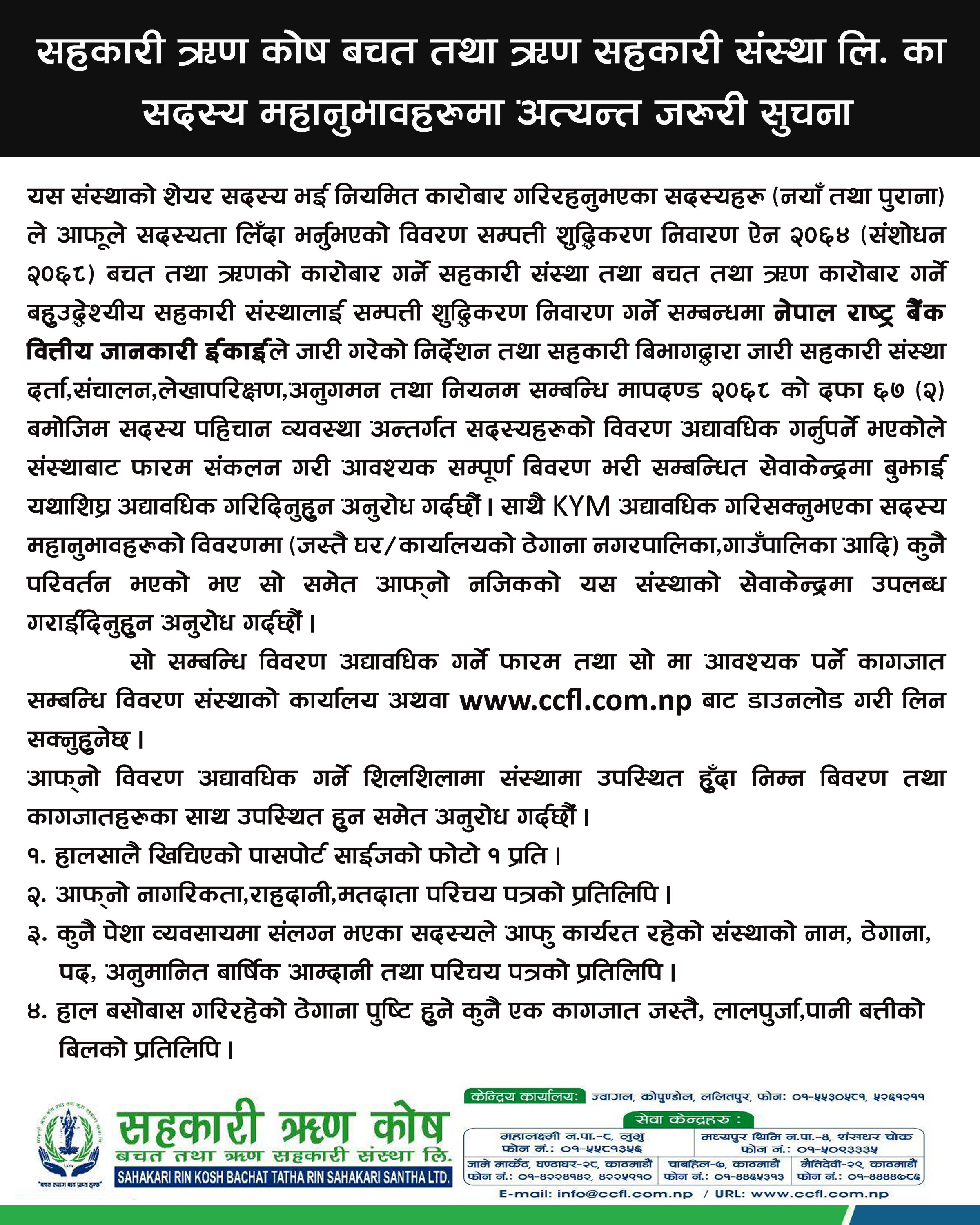 सम्पूर्ण शेयर सदस्यहरुमा " सदस्य पहिचान विवरण फारम" (KYM) आध्यावाधिक गराउन अनुरोध गराउदछौ |