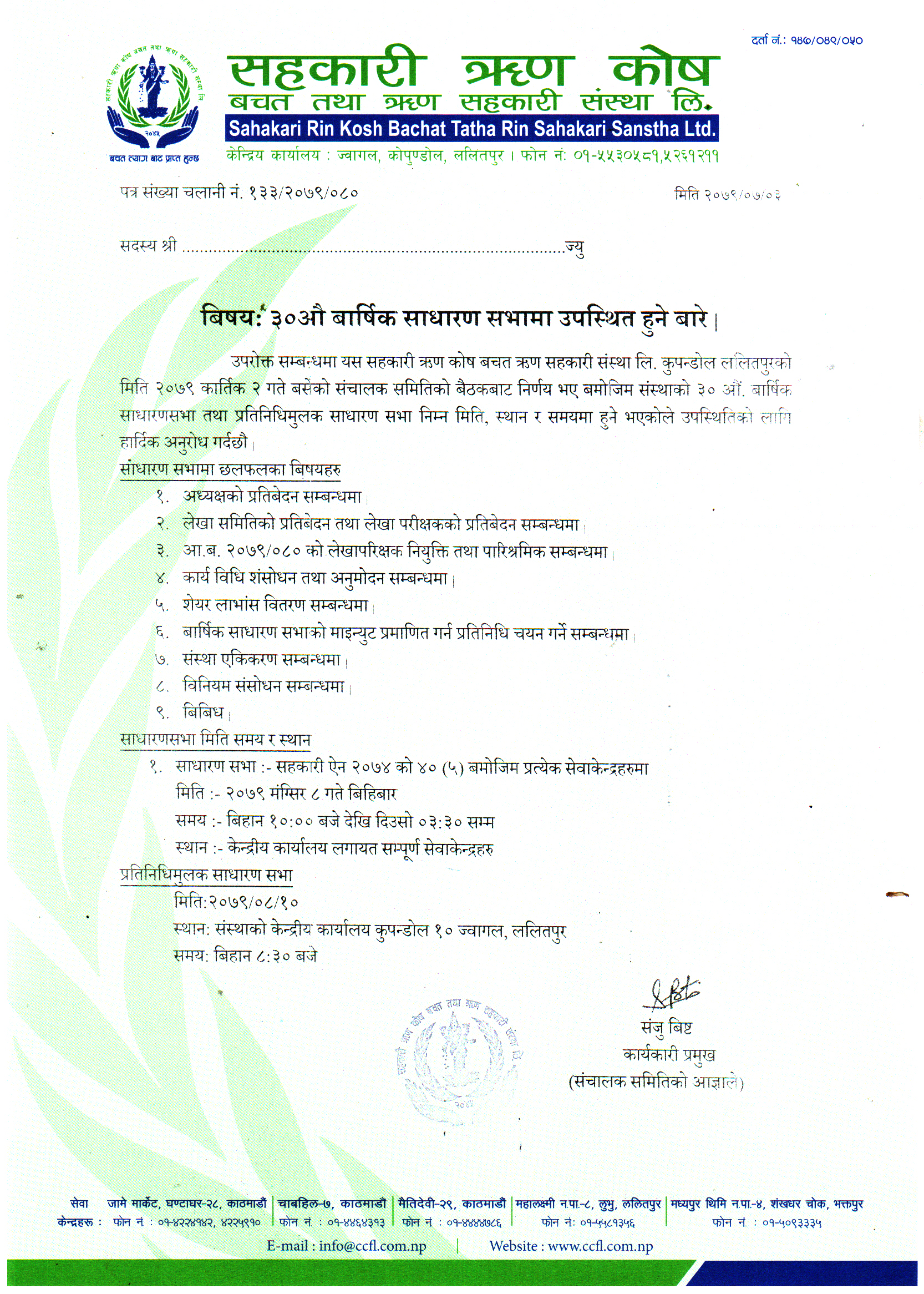 ३०औ बार्षिक साधारण सभामा उपस्थित हुने बारे | २०८०-०८-१३